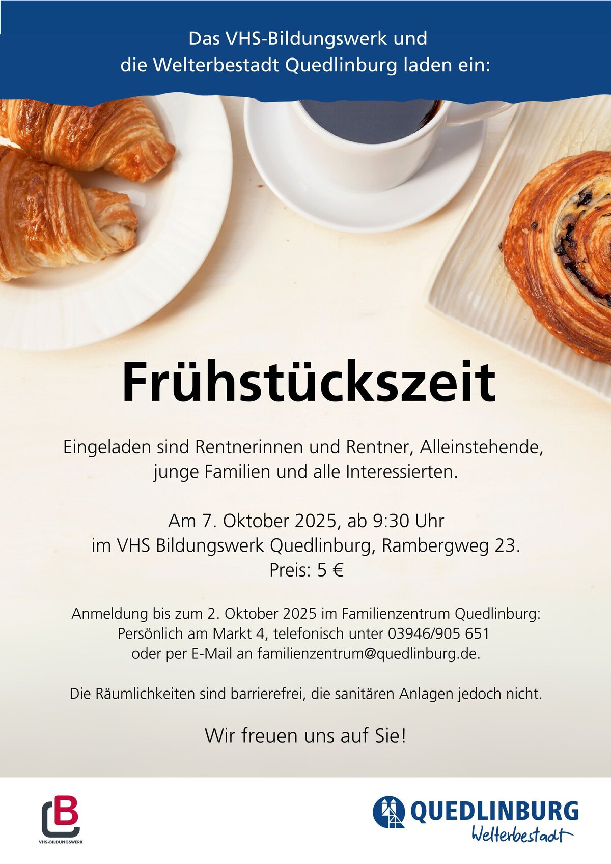 Die Welterbestadt Quedlinburg lädt Bürgerinnen und Bürger zu einem neuen Begegnungsangebot ein: Am Dienstag, dem 7. Oktober 2025, von 9 bis 12 Uhr findet im VHS Bildungswerk Quedlinburg, Rambergsweg 23 ein gemeinsames Frühstück statt.