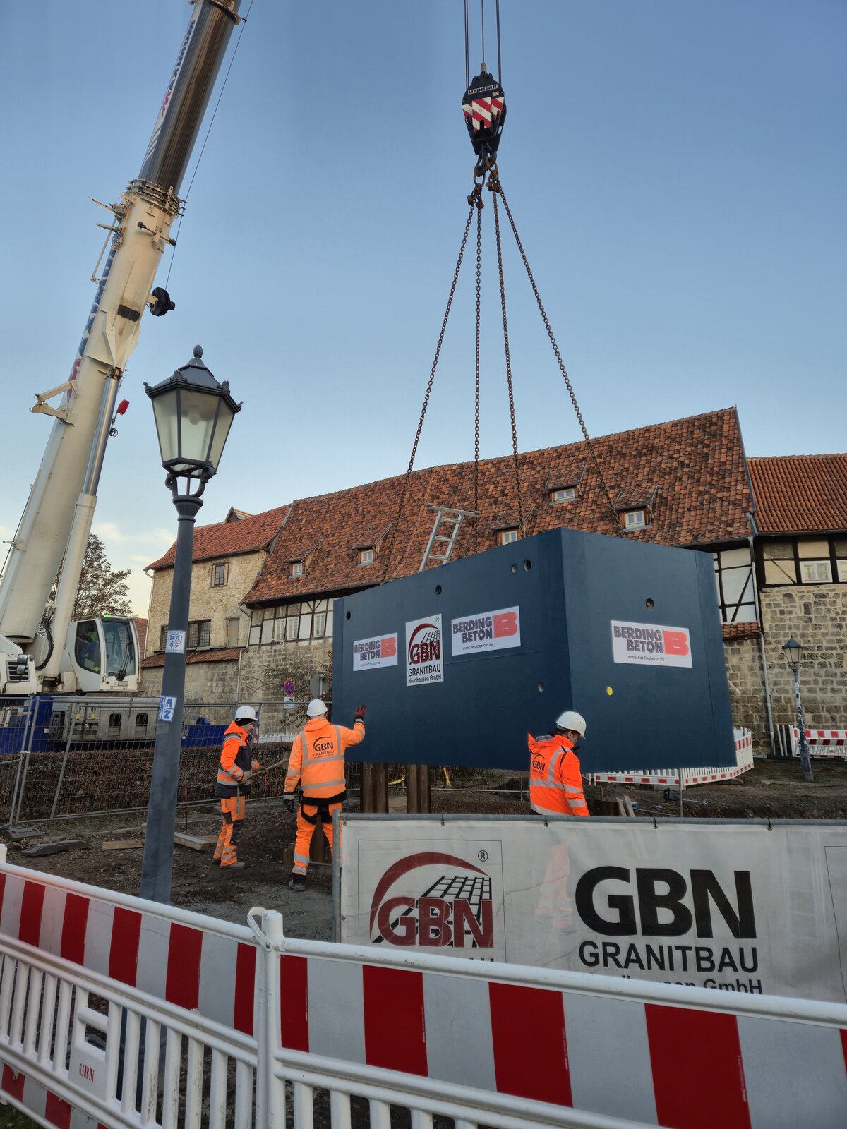Ein bedeutender Schritt für das Bürgerprojekt Denkmal „Brunnen Friedliche Revolution 1989 – 1990 Deutsche Einheit“ ist geschafft: Am Donnerstag, dem 27. November, wurde in der Welterbestadt die Brunnenkammer durch die Firma Granitbau in die vorbereitete Baugrube am Carl-Ritter-Platz eingesetzt.