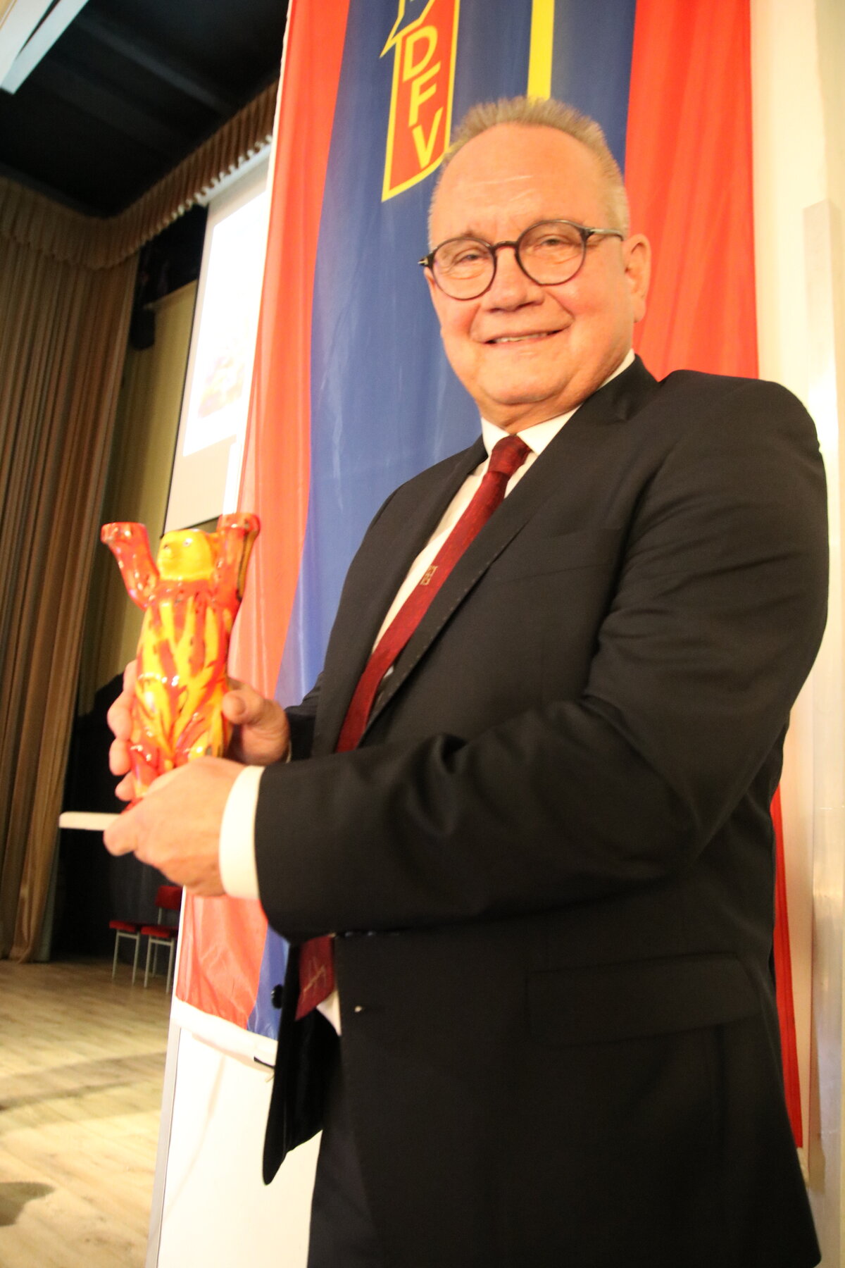Als Zeichen der Verbundenheit überreichte DFV-Präsident Banse Oberbürgermeister Frank Ruch einen Berliner Feuerwehrbären – ein Symbol für Kameradschaft und Dankbarkeit.